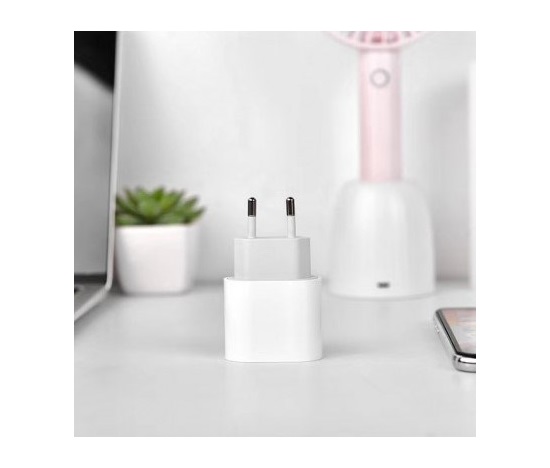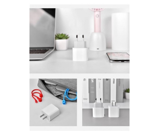 Adaptér do EU zásuvky s jedním USB-C výstupem, který podporuje PD – technologii Power Delivery. Umožňuje nabíjet s výkonem až 20W. Disponuje ochranou proti zkratu a přepětí. Od verze Apple iPhone 8 a vyšší u PD nabíjení, nabije telefon za 30 min přibližně 50% kapacity baterie. Obdobně adaptér funguje u ostatních značek a modelů podporujících rychlé nabíjení.