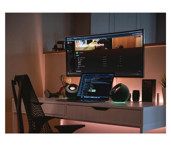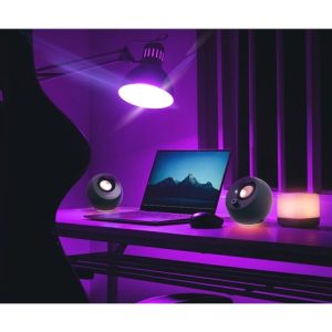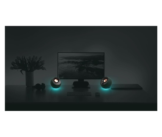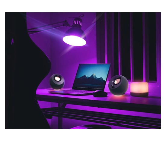 Díky širokému výběru barev a 3 světelným efektům si můžete vybrat nastavení, které bude vyhovovat konkrétní požadované atmosféře. Osvětlení RGB reproduktorů Creative Pebble Pro dokáže procházet spektrem barev, pulzovat do rytmu nebo třeba jen svítit jednobarevnou září. Když je čas skončit, RGB se dá snadno vypnout pomocí ovládacího tlačítka RGB.