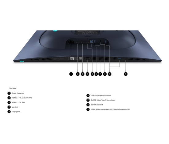 - 2 HDMI ports (HDCP 1.4 & 2.3) (Supports up to 3840 x 2160, 240 Hz, FRL, HDR, VRR as per specified in HDMI 2.1) (including one HDMI 2.1 FRL with eARC/ARC – to support Dolby ATMOS signal pass-through)