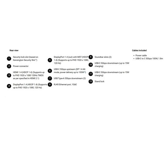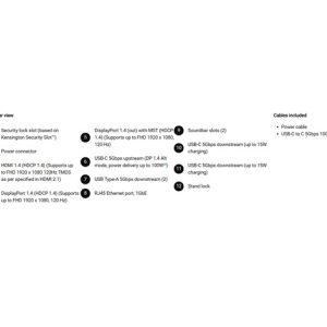 - 1 USB-C 5Gbps upstream port/s (DisplayPort 1.4 Alt Mode, Power Delivery up to 100 W)