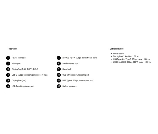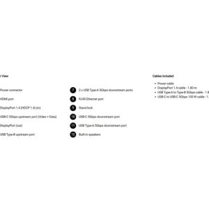 - 1 USB-C 5Gbps upstream port/s (DisplayPort 1.4 Alt Mode, Power Delivery up to 90 W)