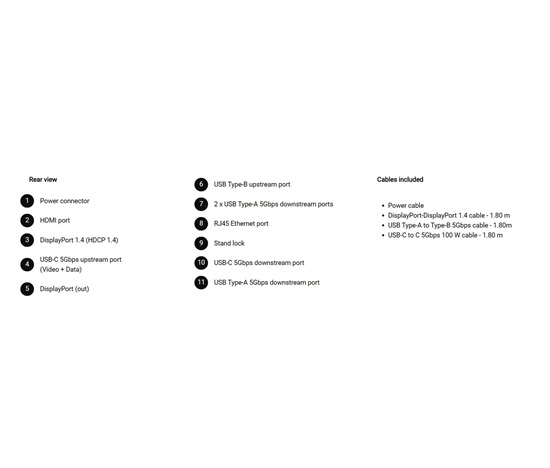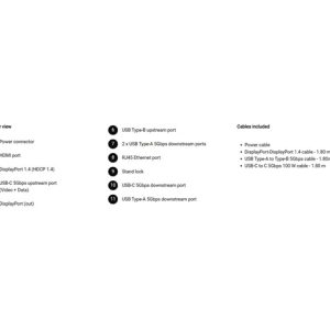 - 1 USB-C 5Gbps upstream port/s (DisplayPort 1.4 Alt Mode, Power Delivery up to 90 W)