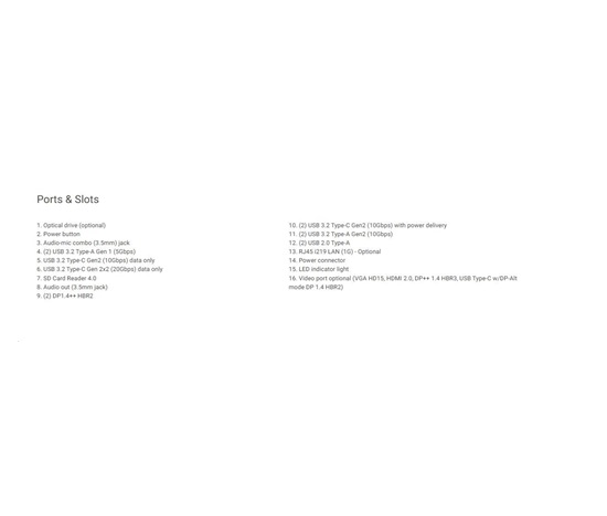 1. Optical drive (optional) 2. Power button 3. Audio-mic combo (3.5mm) jack 4. (2) USB 3.2 Type-A Gen 1 (5Gbps) 5. USB 3.2 Type-C Gen2 (10Gbps) data only 6. USB 3.2 Type-C Gen 2×2 (20Gbps) data only 7. SD Card Reader 4.0 8. Audio out (3.5mm jack) 9. (2) DP1.4++ HBR2 10. (2) USB 3.2 Type-C Gen2 (10Gbps) with power delivery 11. (2) USB 3.2 Type-A Gen2 (10Gbps) 12. (2) USB 2.0 Type-A 13. RJ45 i219 LAN (1G) – Optional 14. Power connector 15. LED indicator light 16. Video port optional (VGA HD15, HDMI 2.0, DP++ 1.4 HBR3, USB Type-C w/DP-Alt mode DP 1.4 HBR2)