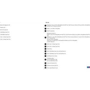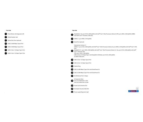 HDMI 2.1, up to 5120 x 3200 @60Hz with Intel Core™ Ultra Processors (Series 2); up to 4096 x 2160 @60Hz with Intel Core™ (14th Gen) DisplayPort 2.1, up to 7680 x 4320 @60Hz with Intel Core™ UltraProcessors(Series 2); 1.4a, up to 5120 x 3200 @60Hz with Intel Core™ (14th Gen) CPU VGA, up to 1920 x 1200 @60Hz USB 3.2 Gen 2 (10 Gbps) Type-C with DisplayPort Alt Mode, up to 5120 x 3200 @60Hz 2x USB-A 10Gb ports