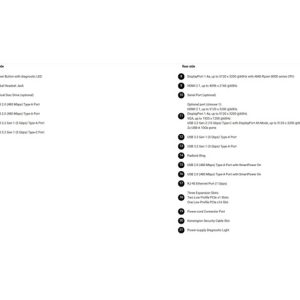 HDMI 2.1, up to 5120 x 3200 @60Hz DisplayPort 1.4a, up to 5120 x 3200 @60Hz VGA, up to 1920 x 1200 @60Hz USB 3.2 Gen 2 (10 Gbps) Type-C with DisplayPort Alt Mode, up to 5120 x 3200 @60Hz 2x USB-A 10Gb ports