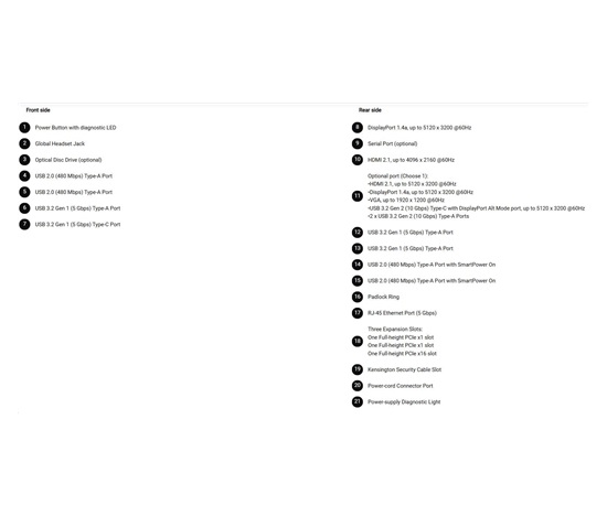 •HDMI 2.1, up to 5120 x 3200 @60Hz •DisplayPort 1.4a, up to 5120 x 3200 @60Hz •VGA, up to 1920 x 1200 @60Hz •USB 3.2 Gen 2 (10 Gbps) Type-C with DisplayPort Alt Mode port, up to 5120 x 3200 @60Hz •2 x USB 3.2 Gen 2 (10 Gbps) Type-A Ports