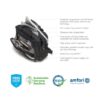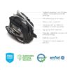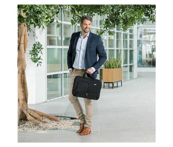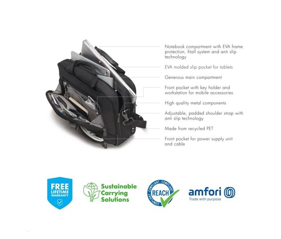 Characteristics • Made of 23 recycled PET bottles • Lockable and cushioned notebook compartment with fitall system and anti slip technology • Maximum security thanks to Memory Foam and EVA frame protection • EVA moulded slip pocket with Nylex material for tablets up to 12.9″ • High-quality metal features • Spacious front pocket with zip-pocket, keychain and workstation for mobile accessories • Additional front pocket for power supply unit and cable • Trolley belt can be turned into an additional document compartment