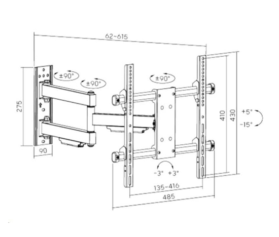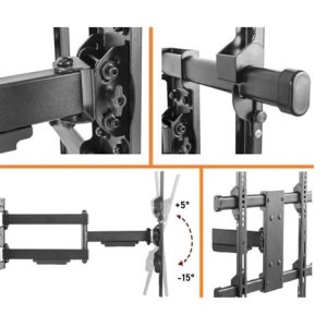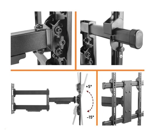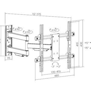 Kvalitní držák Tv 43″ – 60″, vzdálenost od zdi 62 – 615mm, otočný až +90° / -90°, naklápění +5° / -15°, kvalitní pevná konstrukce, úchytky na kabeláž, instalační materiál, VESA 200×100 až 400×400, nosnost 50kg, záruka 10 let