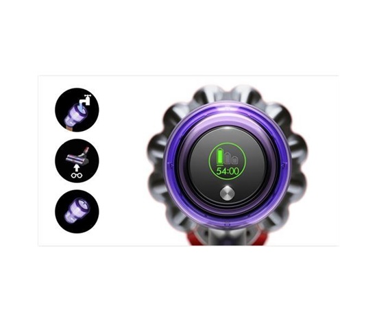 Technologie společnosti Dyson optimalizující výkon a spouštěcí tlačítko šetřící akumulátor pomáhají maximalizovat dobu chodu použitím pouze takového výkonu, který potřebujete.