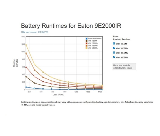 | TECHNICKÉ ÚDAJE PRODUKTU | SEKUNDÁRNÍ FREKVENCE – MAX. 60 Hz KŘIVKA VÝSTUPNÍHO NAPĚTÍ Sinusový výstup MAXIMÁLNÍ POČET BATERIOVÝCH MODULŮ 4 VÝKON 1800 W VÝSTUPNÍ ÚČINÍK 0,9 PROVEDENÍ Rack ZKRESLENÍ NAPĚTÍ VÝSTUPU (LINEÁRNÍ ZÁTĚŽ) – MAX. 3 ZAHRNUJE SÍŤOVOU KARTU Ne ZAPOJENÍ VSTUPU C14 VSTUPNÍ NAPĚTÍ – MIN. 140 V VÝSTUPNÍ NAPĚTÍ – MAX. 240 V SEKUNDÁRNÍ FREKVENCE – MIN. 50 Hz KOMPATIBILITA SOFTWARU Software Eaton Intelligent Power Manager, Eaton Intelligent Power Protector VÝMĚNA BATERIE Vyměnitelné baterie TYP BATERIE Bezúdržbový, olověný ÚČINNOST 91 ZVLÁŠTNÍ CHARAKTERISTIKY Topologie dvojité konverze Neustále monitoruje kvalitu vstupního napájení a reguluje napětí a frekvenci na výstupu Poskytuje větší činný výkon (ve wattech) pro lepší ochranu zařízení s účiníkem 0,9 Interní bypass zajišťuje kontinuitu provozu v případě poruchy UPS LCD displej Dlouhá doba zálohy s až 4 volitelnými EBM |