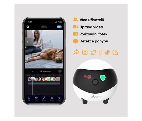 - Zábava pro mazlíčky i děti – EBO SE reaguje na pohyb, lze s ním hrát hry nebo se může stát „společníkem na dálku“.