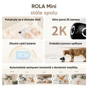 Kamera s rozlišením 2K a širokým zorným úhlem 137° zachytí každý důležitý moment, zatímco obousměrný zvuk umožní mluvit se zvířetem nebo třeba s dětmi doma. ROLA Mini zvládá i vzdálené videohovory – stačí jediné klepnutí v aplikaci a můžete se spojit s kýmkoli, kdo má robota připojeného. Díky vysokokapacitní baterii 5000 mAh robot funguje zcela samostatně, až 25 dní. Jeho odolná konstrukce a pohyblivost zaručují, že zvládne i hravé nárazy nebo nečekané překážky.