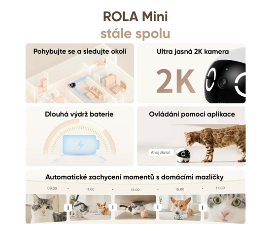 Kamera s rozlišením 2K a širokým zorným úhlem 137° zachytí každý důležitý moment, zatímco obousměrný zvuk umožní mluvit se zvířetem nebo třeba s dětmi doma. ROLA Mini zvládá i vzdálené videohovory – stačí jediné klepnutí v aplikaci a můžete se spojit s kýmkoli, kdo má robota připojeného. Díky vysokokapacitní baterii 5000 mAh robot funguje zcela samostatně, až 25 dní. Jeho odolná konstrukce a pohyblivost zaručují, že zvládne i hravé nárazy nebo nečekané překážky.