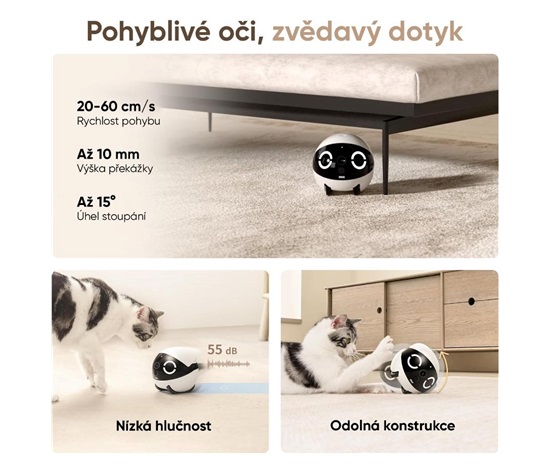 • Dálkové ovládání přes aplikaci – ovládejte robota odkudkoli a sledujte, co váš mazlíček právě dělá.