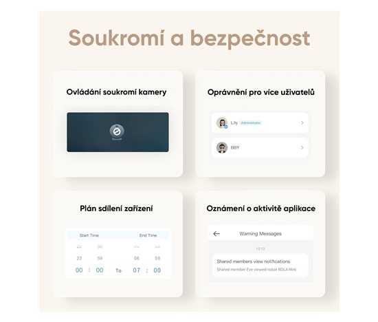 • Vzdálené videohovory – umožňuje volat mezi uživateli robota a aplikace, ideální pro kontakt s rodinou.