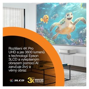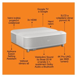 Použití projektoru: Domácí kino / hraní her / streamování / televize a set-top boxy; Typ projekce: Ultra Short Throw (UST); Skutečné rozlišení projektoru: 4K PRO-UHD (3840 × 2160); Projekční poměr: 16:9; Projekční vzdálenost (min) (m): 0,3; Projekční vzdálenost (max) (m): 0,7; Úhlopříčka obrazu (max) („): 120; Technologie: 3LCD (RGB se závěrkou s kapalnými krystaly C2 Fine); Zdroj světla: Laser (životnost až 20 000 h); Kontrast (hodnota : 1): 5 000 000; Jas (ANSI lumenů): 3 600; Zvuk: Sound by Bose + Dolby Audio + Bluetooth (20 W 2.1kanálový systém); Smart funkce: Google TV, Google Assistant, Chromecast, režim ALLM