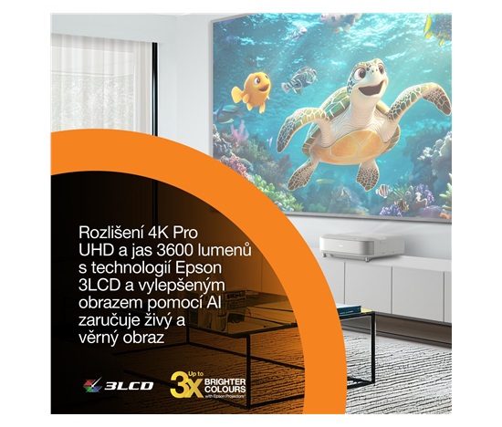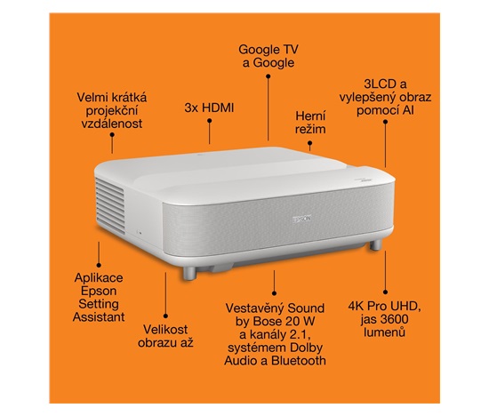 Použití projektoru: Domácí kino / hraní her / streamování / televize a set-top boxy; Typ projekce: Ultra Short Throw (UST); Skutečné rozlišení projektoru: 4K PRO-UHD (3840 × 2160); Projekční poměr: 16:9; Projekční vzdálenost (min) (m): 0,3; Projekční vzdálenost (max) (m): 0,7; Úhlopříčka obrazu (max) („): 120; Technologie: 3LCD (RGB se závěrkou s kapalnými krystaly C2 Fine); Zdroj světla: Laser (životnost až 20 000 h); Kontrast (hodnota : 1): 5 000 000; Jas (ANSI lumenů): 3 600; Zvuk: Sound by Bose + Dolby Audio + Bluetooth (20 W 2.1kanálový systém); Smart funkce: Google TV, Google Assistant, Chromecast, režim ALLM