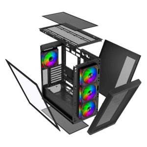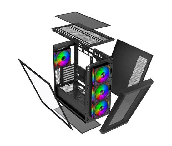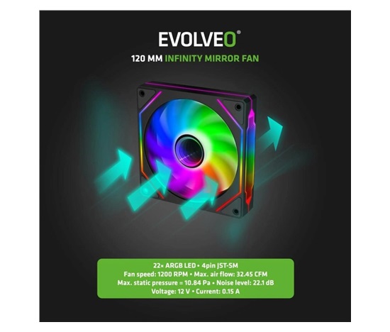 Tato PC skříň je sídlem nejen pro váš hardware, ale i pro čtveřici ventilátorů Infinity Mirror. Ty jsou strategicky rozmístěny a perfektně vyzbrojeny pro boj proti přehřívání počítače, ovšem jak je u EVOLVEO Scorpio-BK-4 dobrým zvykem, dbají i na eleganci. Zdobí je Multi ARGB podsvícení s 22 LED diodami (8 uprostřed a 14 na vnějším obvodu každého ventilátoru), doplněné o působivý zrcadlový design. Díky soustavě zrcadel se světlo odráží a znásobuje, až se vám zdá, že v PC skříni svítí stovky žároviček. Jde o opravdu úchvatný efekt, který dává herní atmosféře tu pravou šťávu. Styl podsvícení ventilátorů můžete nechat na vaší základní desce nebo ho mít díky tlačítku v pravé horní části skříně ve vlastní režii. K dispozici máte 14 barevných režimů, od jednobarevného osvětlení přes decentní prolínání barev až po futuristické blikací módy.