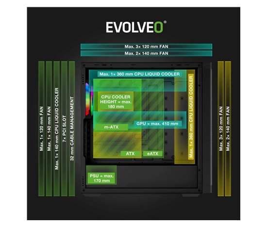 V počítačové skříni EVOLVEO Scorpio-BK-4 je dostatek místa na všechno, co má nadupaná herní mašina mít. Vejde se sem až 415mm grafická karta, chladič procesoru o výšce až 180 mm i všechny potřebné disky – ve skříni jsou 4 pozice pro 3,5″ HDD a 5 slotů pro 2,5″ SSD. Nic vám tak nebrání sestavit si počítač, jehož hardware hraje první ligu. O to, aby vnitřek skříně působil čistě a profesionálně, se navíc stará 32mm Cable Management pro skrytí kabeláže.