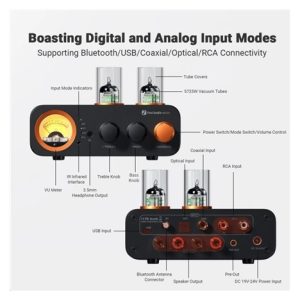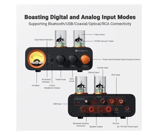 Kompaktní lampový zesilovač s VU metry o výkonu 2x 105W @ 4? kombinuje DAC, zesilovač, předzesilovač a sluchátkový zesilovač v jednom. Vstupy: Bluetooth, USB-C, koaxiální, optický a RCA. Výstupy: pre-out, 3,5 mm sluchátka. Zkreslení ? 0,03 %, SNR ? 100 dB, impedance 4–8 ?. Rozměry: 254 × 51 × 69 mm, napájení 24 V/4,5 A. Součást balení: napájecí adaptér, dálkový ovladač, uživatelský manuál.