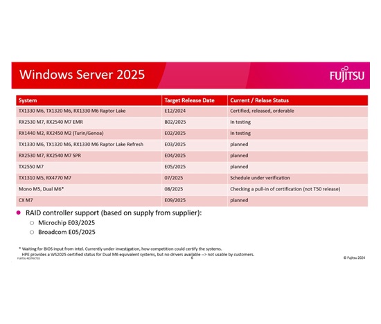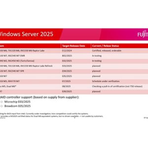 Windows Server 2025 Standard 16 Core ROK. Available only to Fujitsu Broadline Distributors with the ROK Agreement. License card with a COA label; COA label to be affixed on a server system before server shipment. Ships with a server system to the end user.