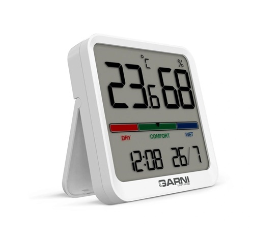 Digitální teploměr s vlhkoměrem pro měření teploty a relativní vlhkosti v interiéru. Zobrazení času a data.