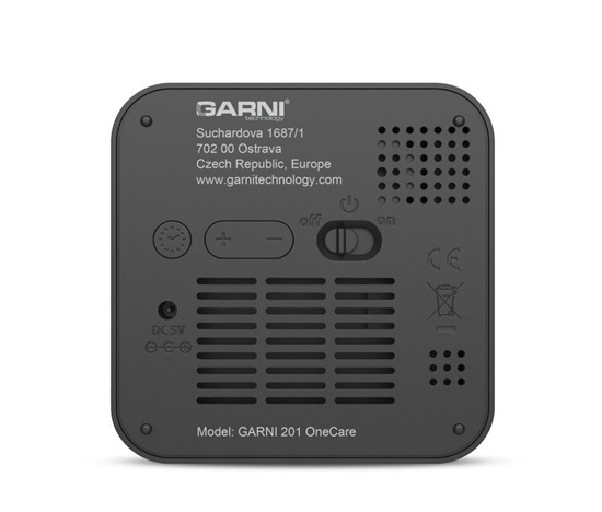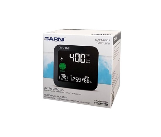 Měřič CO2 (kysličníku uhličitého) GARNI 201 OneCare je určen pro vnitřní použití. Měří a zobrazuje na svém barevném inverzním VA displeji hodnoty CO2 ve vzduchu také teplotu a relativní vlhkost. Pro měření CO2, teploty a relativní vlhkosti je použito fotoakustické čidlo SENSIRION řady SCD4x