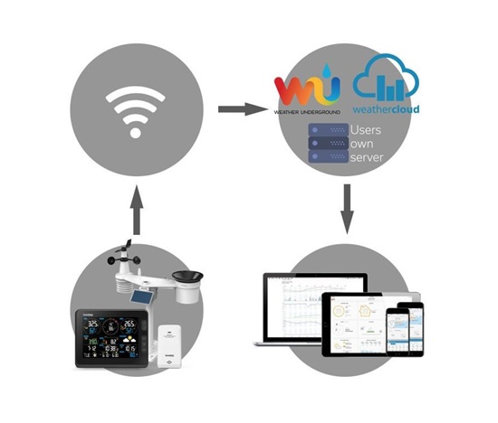 ty pomocí místní Wi-Fi sítě v reálném čase nahrává na zvolený server/servery Weather Underground (https://www.wunderground.com) a Weathercloud (https://weathercloud.net/en),