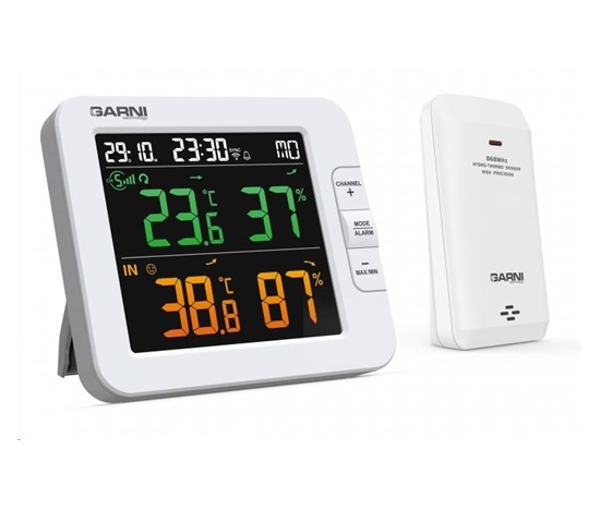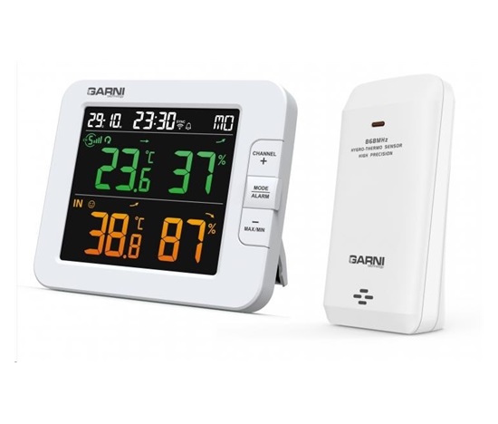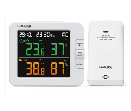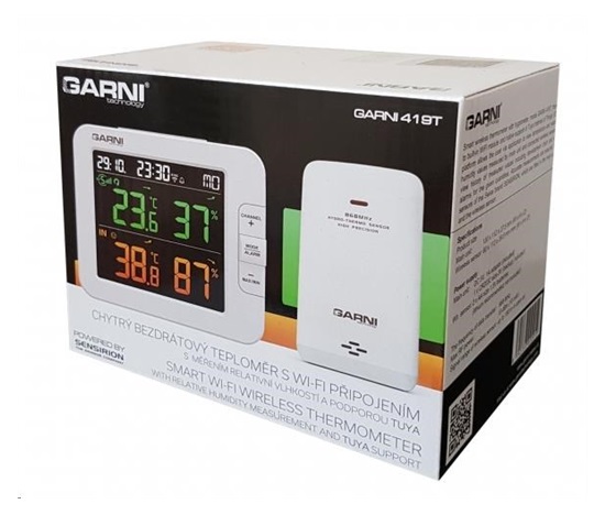 Chytrý vícekanálový teploměr s vlhkoměrem, model GARNI 419T má vestavěný modul WiFi a prostřednictvím svého chytrého systému je kompatibilní s platformou Tuya IOT. Pomocí aplikace Tuya Smart můžete sledovat teplotu a relativní vlhkost hlavní jednotky a bezdrátových čidel, kontrolovat historii záznamů, nastavovat alarmy pro dané veličiny, spouštět pokročilé funkce za pomocí naměřených hodnot a naměřená data odeslat na email v Excel souboru. Je možné jej propojit s dalšími produkty chytré domácnosti, ovládání pak probíhá přes aplikaci v mobilním zařízení. Hlavní jednotka i bezdrátové čidlo jsou osazeny švýcarskými čidly SENSIRION.