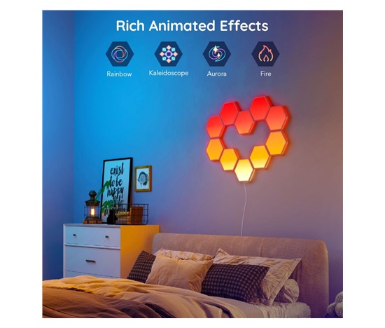 Govee Hexa nabízí 38 různých režimů pro dokonalé naladění světelné atmosféry. Govee technologie RGBIC umí zobrazit až 57 barev najednou z celkové škály 16 milionů barev při intenzitě 1-100%. Může se také pochlubit životností až 50.000 hodin.