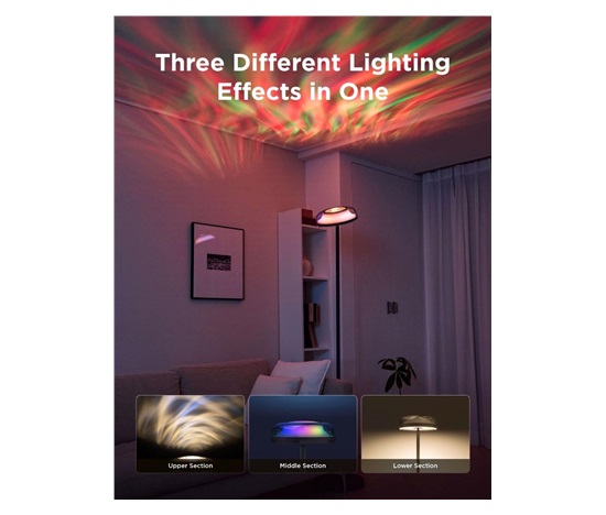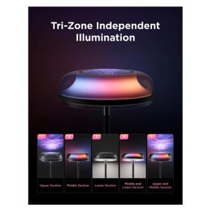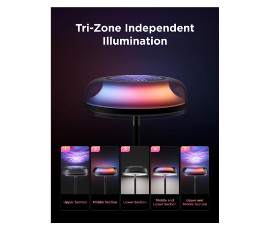 Trojité zónové osvětlení umožňuje individuálně nastavovat spodní, střední a horní část lampy podle vašich potřeb. Spodní LED poskytuje praktické každodenní světlo, střední zóna jemně osvětluje prostor a horní projekční efekt přidává dramatický vizuální zážitek. Díky tomuto systému můžete vždy vytvořit dokonalou atmosféru pro každou příležitost.