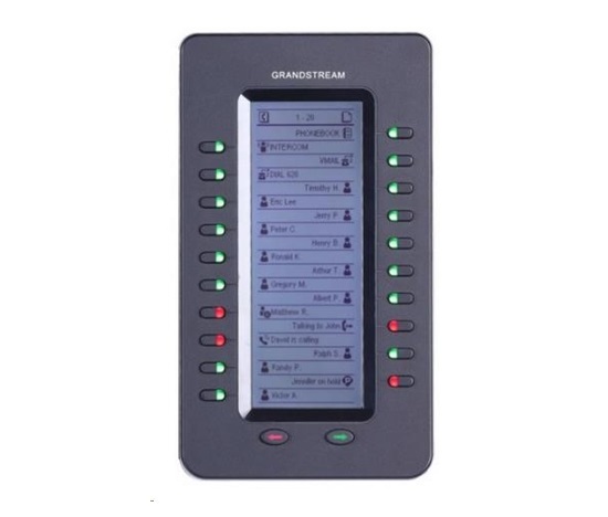 GXP2200EXT je externí jednotka s 20 tlačítky pro rychlou volbu účastníka a 2 tlačítky pro přepínání stránky = celkem 40 uložených předvoleb. Barva led diody u každého tlačítka indikuje aktuální stav uživatele, zda například již telefonuje (s kým) nebo je zaneprázdněný.