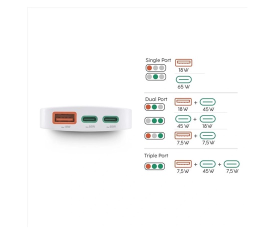 – technologie GaN s vysokou účinností a nízkým vyzařováním tepla umožňuje výrazné zmenšení velikosti nabíječky při zachování vysokého výkonu