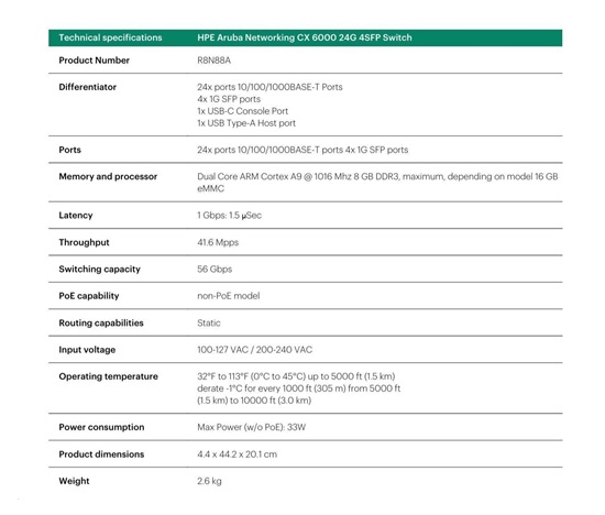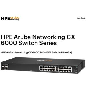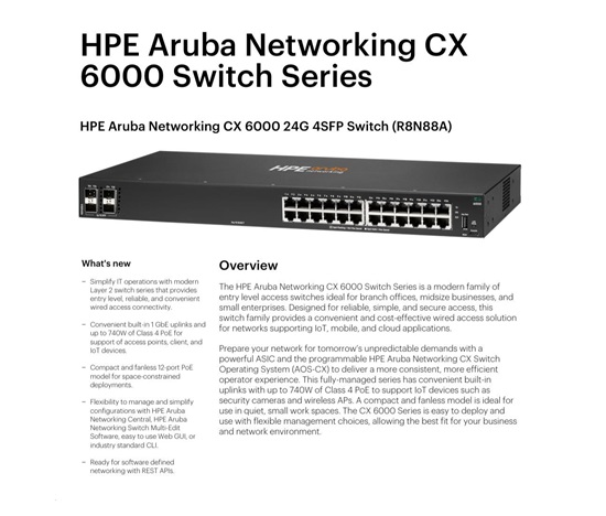 The HPE Aruba Networking CX 6000 Switch Series is a modern family of entry-level access switches ideal for branch offices, midsize businesses, and small enterprises. Optimized for reliable, simple, and secure access, the CX 6000 Switch series provides a convenient and cost-effective wired access solution for networks supporting IoT, mobile, and cloud applications.
