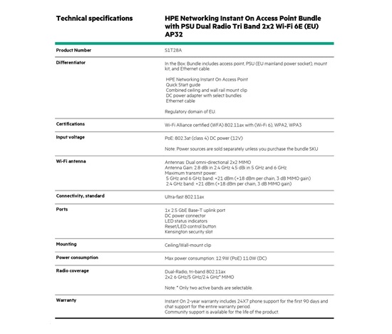 HPE Networking Instant On Access Point Bundle with PSU Dual Radio Tri Band 2×2 Wi-Fi 6E (EU) AP32 ( S1T28A )