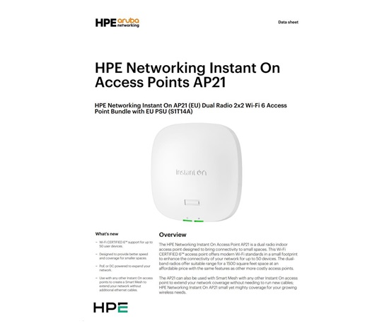 Úvod IT Síťové prvky Wi-Fi aktivní prvky HPE Networking Instant On AP21 (EU) Dual Radio 2×2 Wi-Fi 6 Access Point Bundle with EU PSU