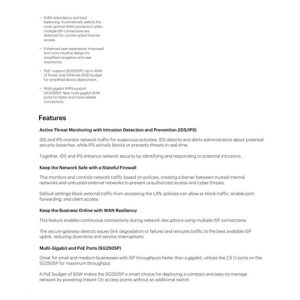 The HPE Networking Instant On Secure Gateways deliver a wide range of advanced technical features designed to boost network performance and enhance security for SMBs. One key feature is VPN, which provides encrypted site-to-site communication between Instant On Secure Gateway sites, allowing businesses to connect multiple locations more securely. Additionally, the built-in Intrusion Detection and Prevention System (IDS/IPS) actively monitors network traffic for suspicious activity and automatically blocks malicious content threats, ensuring the integrity of business data. And with automatic firmware updates that keep security patches up to date and easy-to-use management through the Instant On cloud portal and mobile app, maintaining a more secure network has never been easier. The gateway also supports WAN resiliency through failover features, ensuring continuous network service even during ISP outage events.