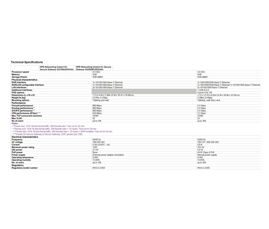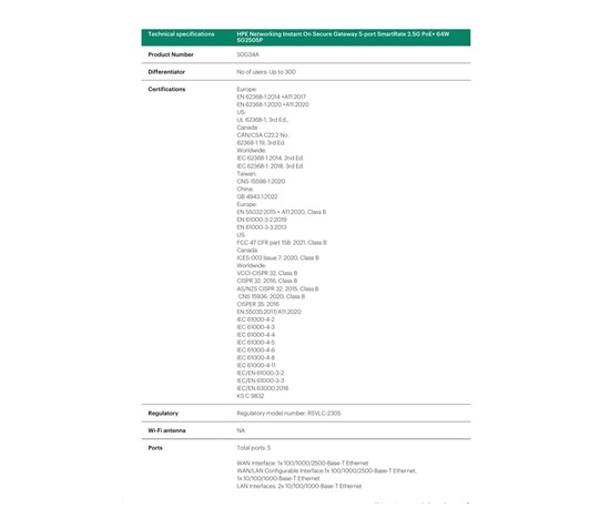 For larger environments, the HPE Networking Instant On Secure Gateway SG2505P offers five ports, two of them providing multigigabit support. One multi-gig uplink (WAN) port, one multi-gig configurable port (WAN/LAN), one gig configurable port (WAN/LAN), and two one-gig ports (LAN). The 2505P has PoE support with a total power budget of 64W to power network devices such as Instant On access points. With a stateful firewall throughput of 2.3 Gbps, this gateway is ideal for businesses requiring over 1 Gigabit of total throughput from their ISP. Whether you’re a small shop looking to keep the network simple or an AI startup needing to protect your large data workloads, the SG2505P will help you stay connected and more secure.