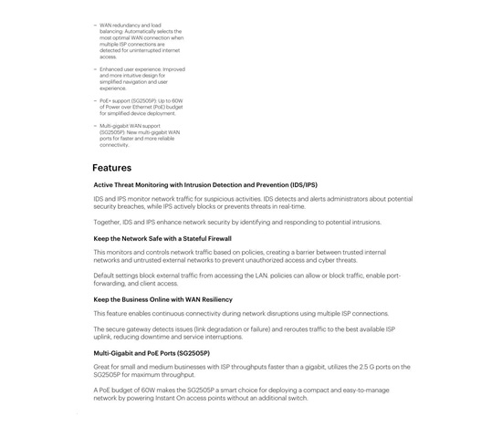The HPE Networking Instant On Secure Gateways deliver a wide range of advanced technical features designed to boost network performance and enhance security for SMBs. One key feature is VPN, which provides encrypted site-to-site communication between Instant On Secure Gateway sites, allowing businesses to connect multiple locations more securely. Additionally, the built-in Intrusion Detection and Prevention System (IDS/IPS) actively monitors network traffic for suspicious activity and automatically blocks malicious content threats, ensuring the integrity of business data. And with automatic firmware updates that keep security patches up to date and easy-to-use management through the Instant On cloud portal and mobile app, maintaining a more secure network has never been easier. The gateway also supports WAN resiliency through failover features, ensuring continuous network service even during ISP outage events.