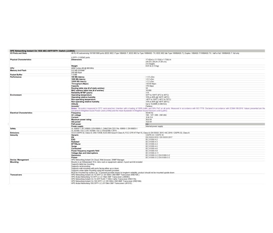 Notes: 1Acoustics measured in 23°C semi-anechoic chamber with a loading of 100% traffic and 50% PoE on all ports. Measured in accordance with ISO 7779. Declared in accordance with ECMA-109:2010. Values presented are the Declared A-Weighted Sound Power Level (LWAd) and the mean Bystander A-Weighted Sound Pressure Level (LpAm)
