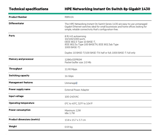 • Product Name: HPE Networking Instant On Switch 1430 8-Port Gigabit