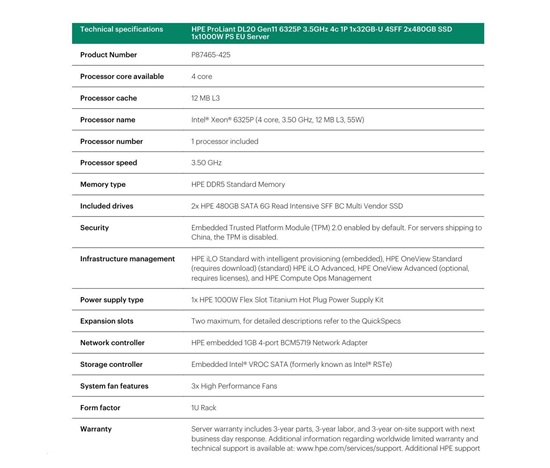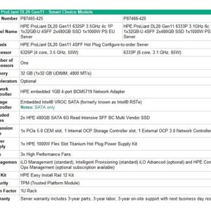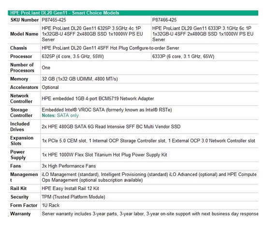 HPE PL DL20g11 6325P (3.5G/4C8T) 1x32G 2x480G SSD VROC 4SFF-HP 4p1Gb 1x1000W Smart Choice