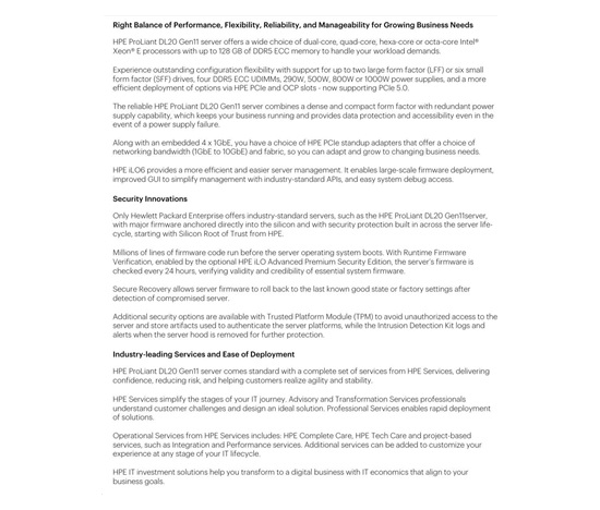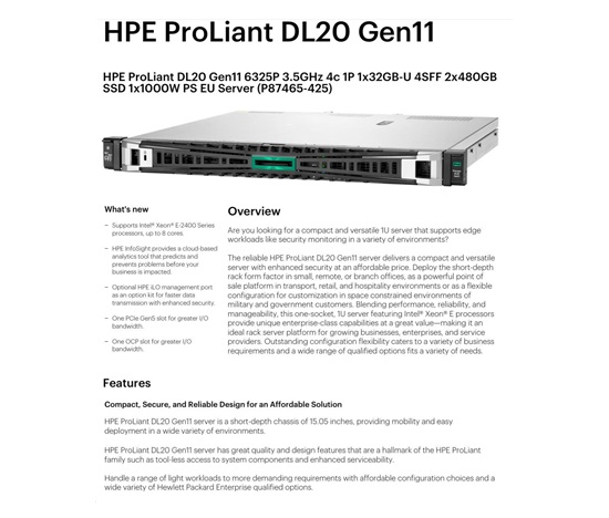 Úvod IT Servery a zálohování Servery HPE PL DL20g11 6325P (3.5G/4C8T) 1x32G 2x480G SSD VROC 4SFF-HP 4p1Gb 1x1000W Smart Choice