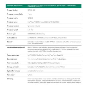 Provedení serveru:Rack, 1U Rack; Výrobce CPU:Intel; Maximální počet procesorů:1; Řada procesorů:Intel 4 Core Xeon; SSD Kapacita (GB):480; Model procesoru:Intel Xeon E-2434; Velikost paměti RAM (GB):32; Maximální paměťová kapacita serveru (GB):128; Maximální počet slotů PCIe:2; Maximální počet HDD v serveru:4; Hot-plug cage pro HDD:2.5″ SFF; RAID:1, 5