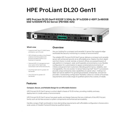 Úvod IT Servery a zálohování Servery HPE PL DL20 gen11 6333P (3.1G/6C12T) 1x32G 4SFF 2x480GB VROC 1x1000W 4x1G NBD333 Smart Choice