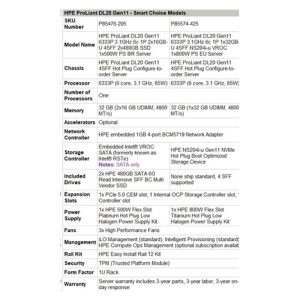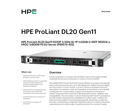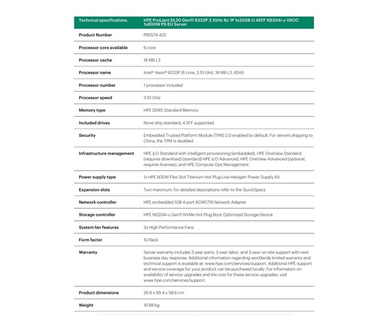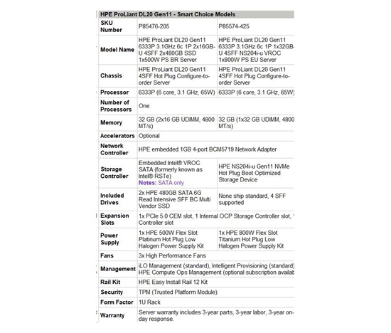 HPE PL DL20 gen11 6333P (3.1G/6C12T) 1x32G (P64339) 4SFF NS204i-u (2x480Gnvme) VROC 1x800W 4x1G NBD333 Smart Choice