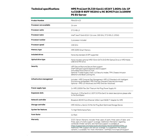 Úvod IT Servery a zálohování Servery HPE PL DL320g11 6526Y (2.8/16C) 4x32G (p64706) 8SFF NS204(2x480Gm.2) VROC 2x1000W 2p10GT 7F Smart Choice