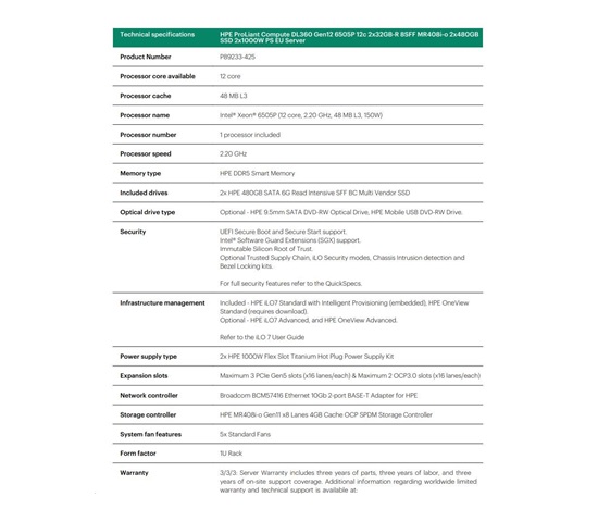 HPE PL DL360g12 6505P (2.2G/12C) 2x32G (P69727) 2×2.4TB MR408i-o 8SFF 2x1000W 2p10GbE NBD333 Smart Choice