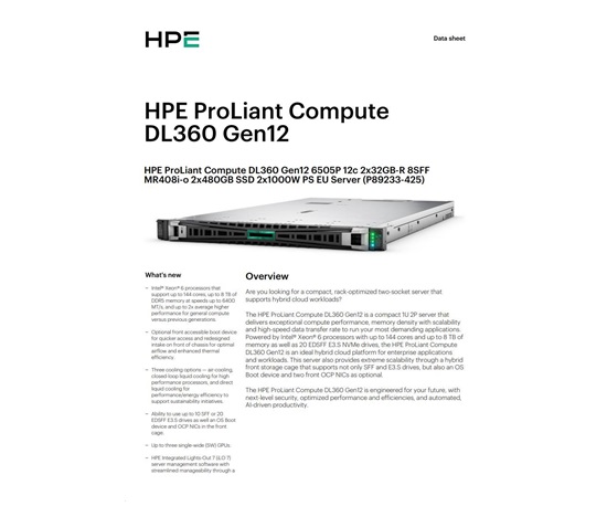 Úvod IT Servery a zálohování Servery HPE PL DL360g12 6505P (2.2G/12C) 2x32G (P69727) 2×2.4TB MR408i-o 8SFF 2x1000W 2p10GbE NBD333 Smart Choice