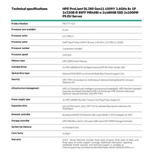Provedení serveru:Rack, 2U Rack; Výrobce CPU:Intel; Maximální počet procesorů:2; Řada procesorů:Intel 8 Core Xeon; Model procesoru:Intel Xeon 4509Y; Velikost paměti RAM (GB):64; Maximální paměťová kapacita serveru (GB):6144; Maximální počet slotů PCIe:3; Maximální počet HDD v serveru:8; Hot-plug cage pro HDD:2.5″ SFF; RAID:1, 5, 10, 60